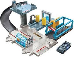 Have new movie, high tech fun at Rust-Eze Racing Center! Inspired by Disney/Pixar Cars 3, this sleek, two level set has multiple play areas with innovative features. Floor one hosts the champs museum where you can admire Lightning McQueens wheels on the spinning display and behold his iconic 95 victory statue. Then take the spiral ramp or the elevator to the top floor.