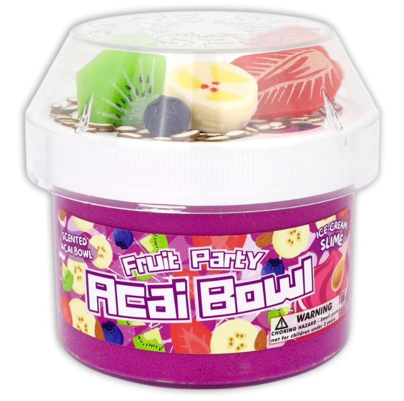 Scoop up some squishy fun with our Acai Bowl Fruit Party slime! This vibrant magenta ice-cream textured delight comes w/ realistic-sized kiwi, strawberry, banana, and blueberry charms, plus adorable almond fimo pieces. The mouthwatering scent perfectly captures the essence of a fresh acai bowl treat! Squish, stretch, and treasure hunt through this fruity paradise that’s a feast for your fingers and nose – no spoon required!