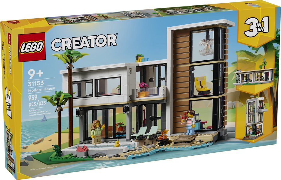 Boys and girls aged 9+ can explore 3 different LEGO® toy houses with this fun-filled Modern House (31153) playset. The luxurious 2-story beach house sits in the shade of 2 palm trees and has a kitchen, living room, reading room, bedroom, shower room, balcony and modern furnishings including an armchair and chandelier. There is also a swimming pool for kids to role-play fun stories.