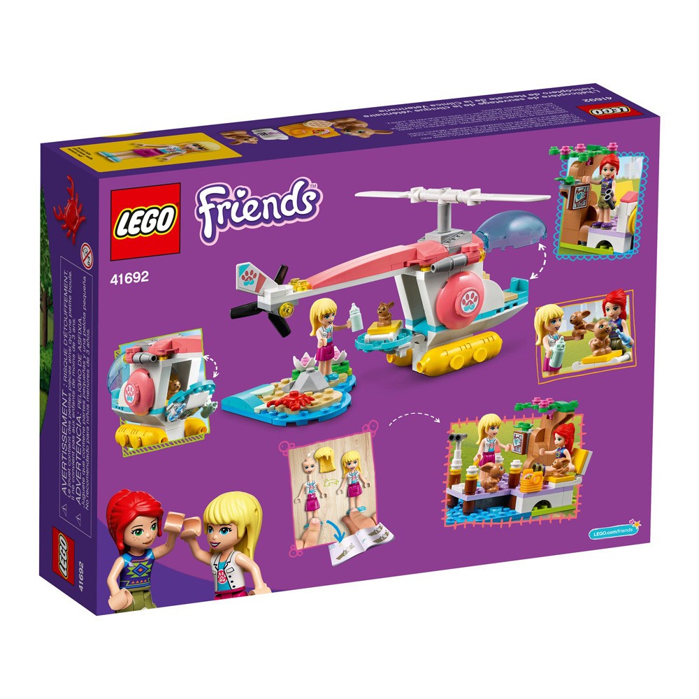 • This colorful children’s animal playset includes LEGO Friends Stephanie and Mia mini-dolls, a rabbit and a bunny toy, and a helicopter with spinnable rotors, vet’s kit and a hinged rear tailgate
