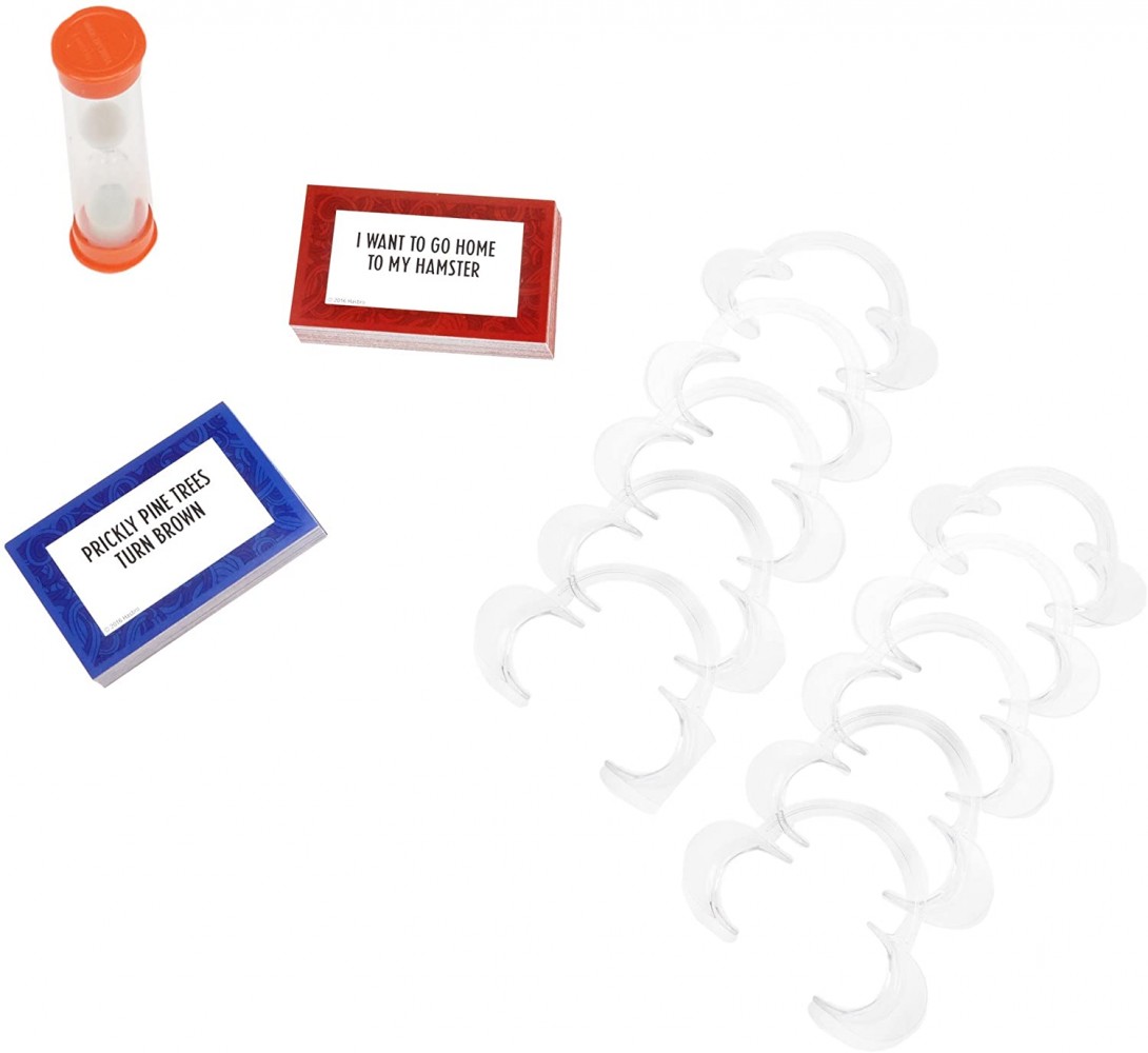 Get ready to be doubled over with laughter with this ridiculous mouthpiece challenge game! The Speak Out game brings friends and family together for laugh-out-loud fun as players try to say different phrases while wearing a mouthpiece that won’t let them shut their mouth. In the Speak Out game, players draw from the deck and read the phrase as best as they can, but it’s not so easy to do when the mouthpiece is hindering them from forming words correctly.