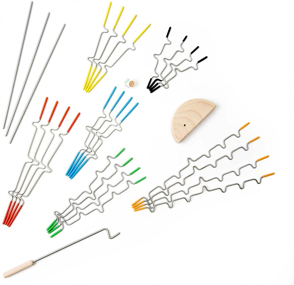 This award-winning “teetering, wobbling, shifting, tipping, unbalanced, balance game” is a must-have for family game night, Take turns hanging the notched, rubber-tipped wire pieces from the tabletop stand. With each added piece, the balance shifts and the sculpture transforms. But watch out! One wrong move could send it all crashing down, Suited for 1-4 players. Besides being an exciting game to play, Suspend helps promote important developmental skills. Retrieving and placing the wire pieces helps refine fine motor skills and hand-eye coordination, while the strategic thinking and logic involved in deciding where to place a piece helps brush up those problem-solving skills. Playing games also helps children make social-emotional connections and learn important concepts like taking turns, playing fair, and winning and losing gracefully. Our activity game for families is easy to set up and play. This hand-eye coordination game includes 24 game rods, wooden base, 4 frame rods, colored die, and wooden connector.